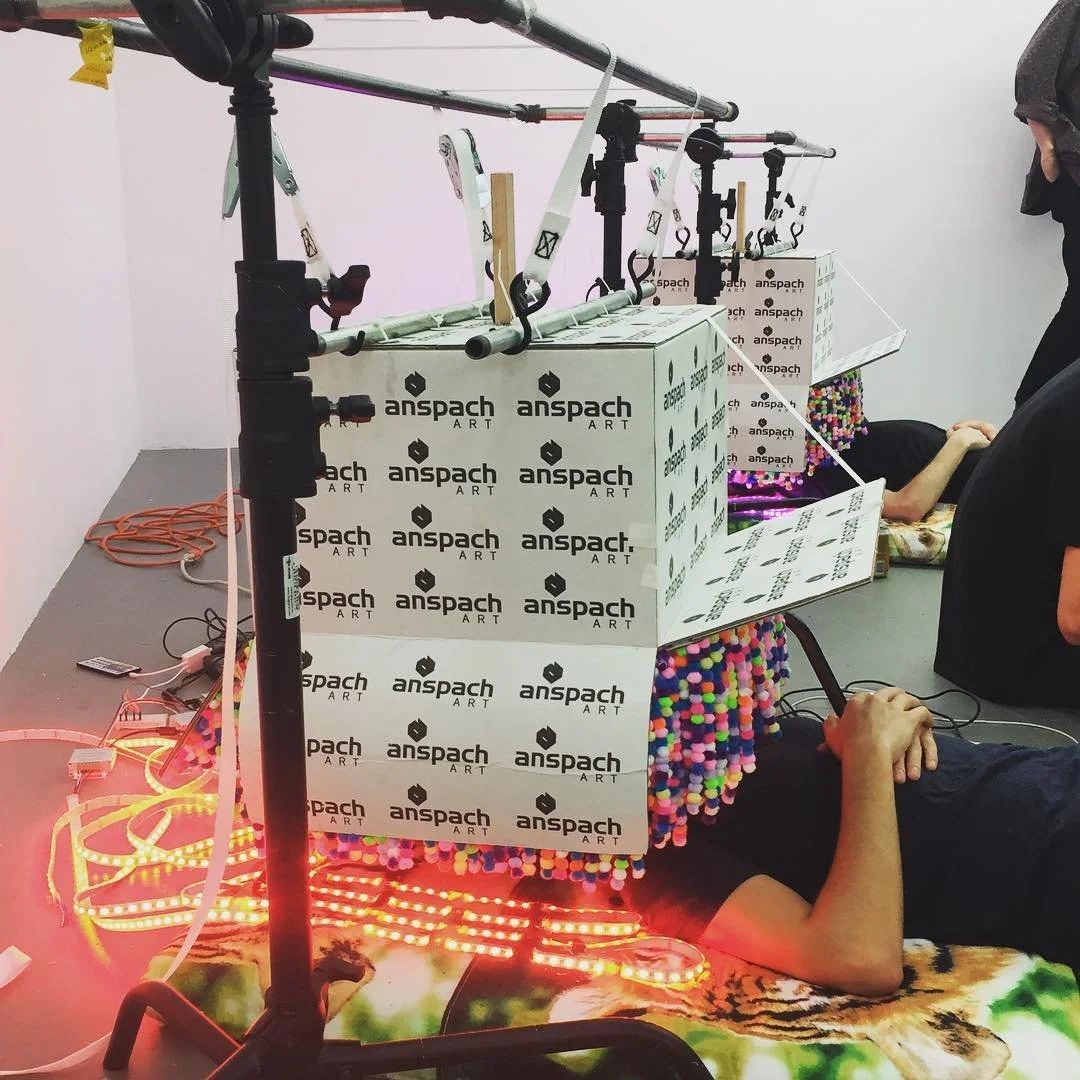 Bobby Anspach was an American artist whose work centered around the creations of sculptural installations designed to deliver transcendent experiences to viewers, all part of a series titled Place for Continuous Eye Contact. As much a sculptor as an inventor, these devices are currently undergoing a patenting process. Employing a DIY-technique through all of his work, Anspach was focused on creating brilliant, unexpected, and sublime experiences that blend common objects with high craft, ranging from pom-poms to hand-blown glass to medical beds, aiming to inspire viewers to look within and discover everyday beauty and the natural world. These works create an experience that at first appears scrappy and chaotic, and quickly blends into a seamless, all-encompassing, and otherworldly space. His work was informed by a deep respect for the environment and meditation, and founded on a belief of the interconnectedness of all things that was aimed to create a cared experience between all viewers of his work.
